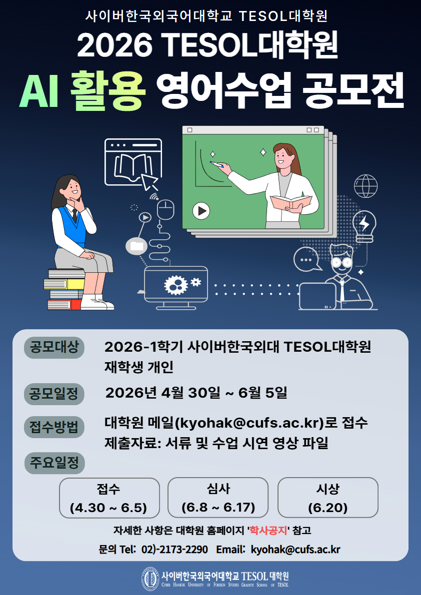 아래와 같이 ‘2026 TESOL대학원 AI 영어수업 공모전’을 개최하오니 재학생 여러분의 많은 참가바랍니다.