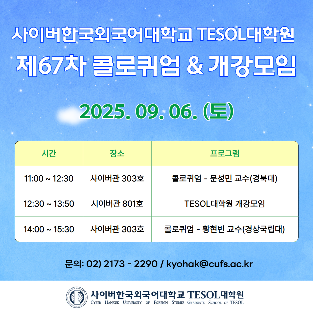 사이버한국외국어대학교 TESOL대학원(67차) & 일반대학원에서 주최하는 콜로퀴엄 안내 드리오니, 많은 관심과 참여 부탁드립니다.