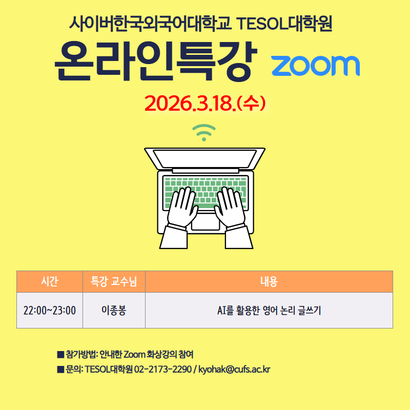 3월 18일(수) TESOL대학원 온라인 특강 일정을 안내 드리오니 재학생 여러분의 많은 참여 부탁드립니다.