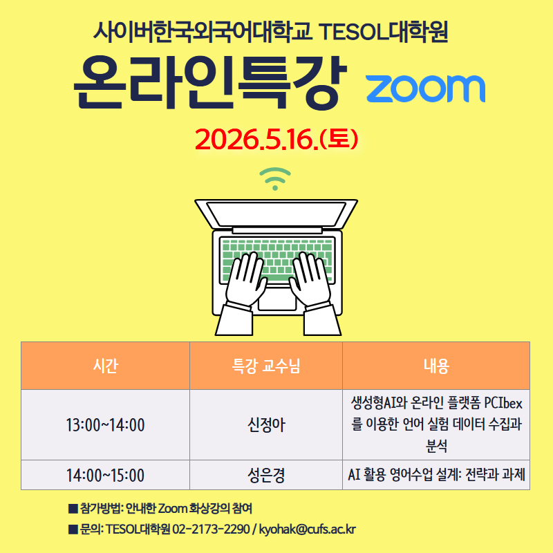 5월 16일(토) TESOL대학원 온라인 특강 일정을 안내 드리오니 재학생 여러분의 많은 참여 부탁드립니다.